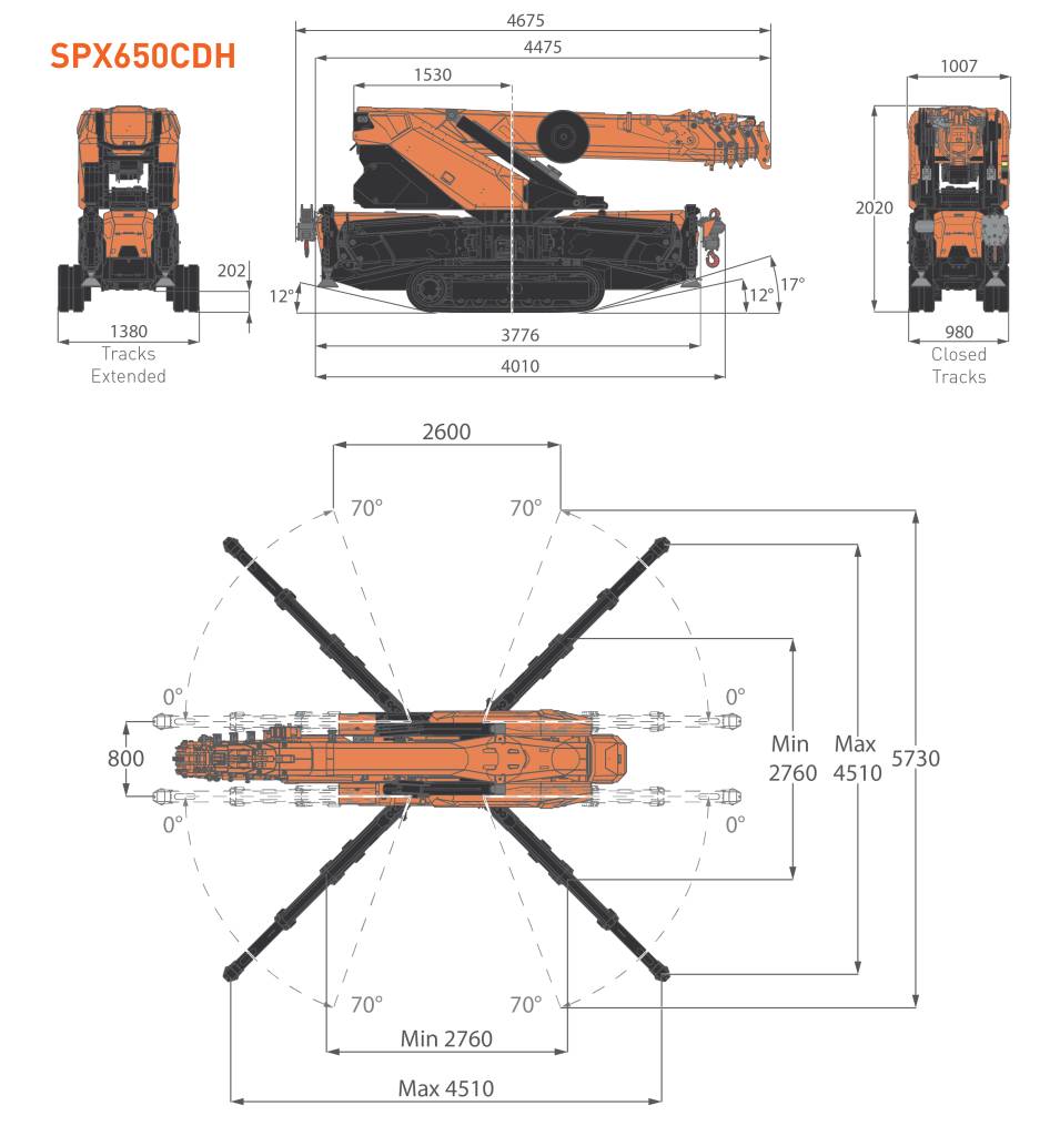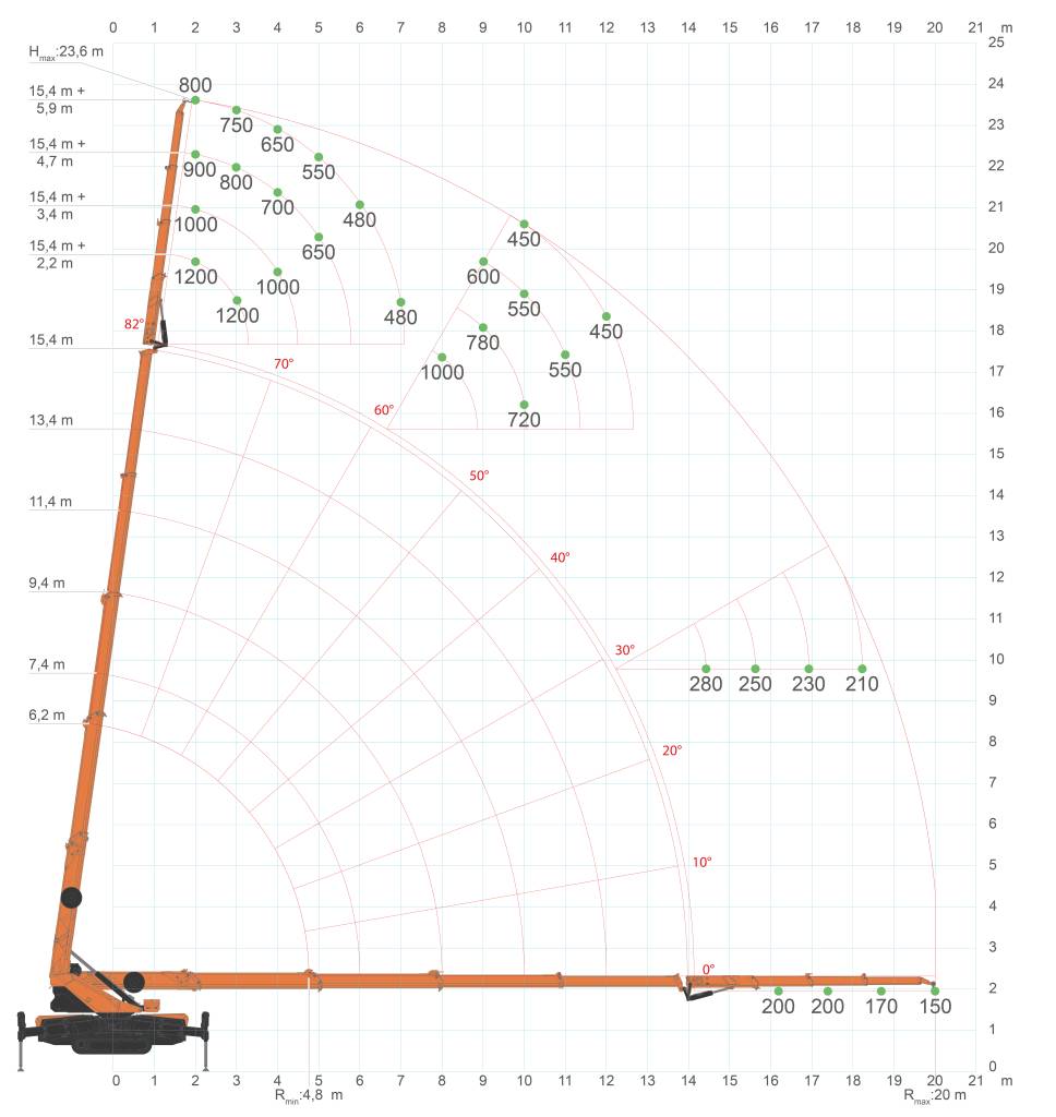 Maximale Tragfähigkeit: 5.000 kgHubhöhe: 23,6 mHorizontale Reichweite: 20,0 m